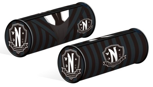 Kulatý penál s uzavíráním na zip s licenčním motivem Wednesday.