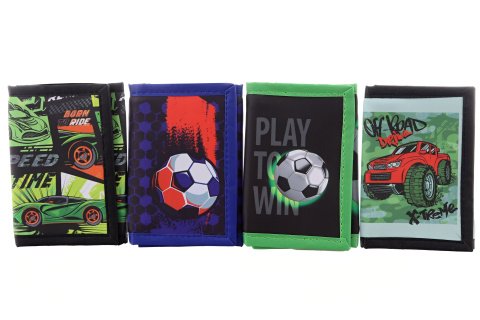 Chlapecká látková peněženka s motivem fotbalu nebo aut. Z vnějších stran je pěněženka pogumovaná. Uvnitř jedna velká kapsa na zip a několik menších bez zavírání. Rozměry rozložené peněženky 23,5x11,5 cm. Rozměry složené peněženky 8x11,5 cm. Baleno v sáčku. 4 druhy - dodáváme dle skladové dostupnosti. Výrobek není hračka.
