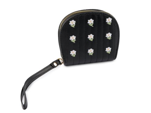 Malá šikovná peněženka se vejde do každé kabelky. Přední stranu má ozdobenou [výšivkou květů]. Tento roztomilý motiv přinese hravý prvek do vašeho každodenního stylu. Peněženka je vybavená dlouhým poutkem k nošení na zápěstí. Zavírá se na zip. Uvnitř najdete hlavní prostor oddělený přepážkou na dva menší. V přepážce je mincovník na zip. Po stranách jsou ještě 4 přihrádky na karty.