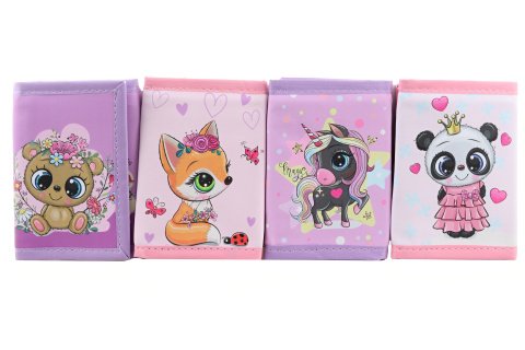 Peněženka s motivem roztomilých zvířátek. Uzavírání na suchý zip, uvnitř jedna velká příhrádka na zip a několik menších na vkládání. Peněženka má šňůrku pro zavěšení na krk. Rozměry peněženky 8x11,5x0,5 cm. Baleno v sáčku. 4 druhy - dodáváme dle skladové dostupnosti. Výrobek není hračka.