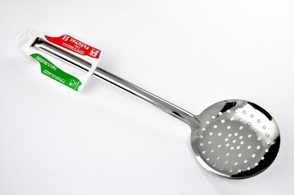 Kvalitní celonerezová cedící lžíce s háčkem na zavěšení, délka 35.5 cm, průměr hlavy 11 cm, vhodná do myčky nádobí.