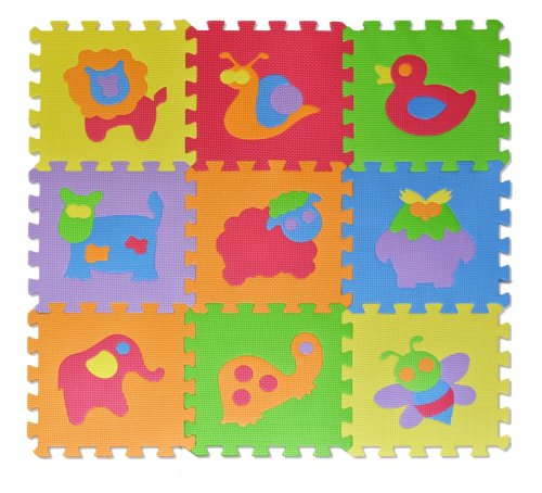 Pěnové puzzle s motivem zvířátek s vyjímatelnými dílky pro děti od 3 let. Bezpečná a měkká podložka je omyvatelná, tlumí hluk a izoluje od chladu, je proto ideální jako hrací koberec nejen do dětských pokojů. Puzzle má vroubkovaný povrch. Tloušťka pěnového puzzle je 0,7 cm. Balení obsahuje 9 čtvercových dílů. Velikost jednoho dílu je 28 x 28 cm (měřeno od zubu po výřez).