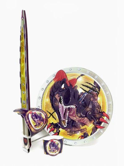 „Dětský pěnový meč a štít s motivem D-Rexe pro malého samuraje. Souprava je vyrobena z pěny a je velmi bezpečná. Vhodné jako doplněk ke karnevalovému kostýmu.“