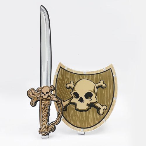 „Dětský pěnový meč a štít s motivem piráta pro malého samuraje. Souprava je vyrobena z pěny a je velmi bezpečná. Vhodné jako doplněk ke karnevalovému kostýmu.“