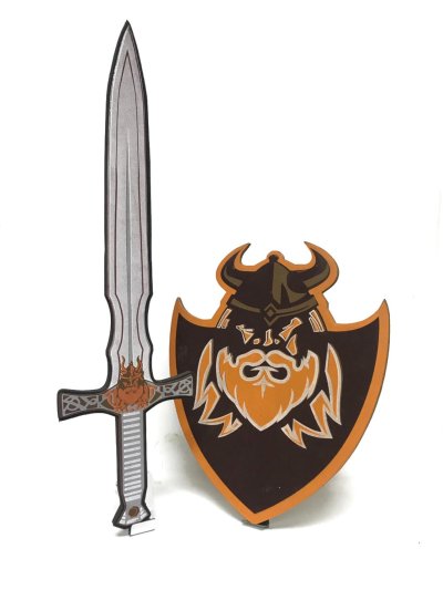 „Dětský pěnový meč a štít s motivem vikinga pro malého samuraje. Souprava je vyrobena z pěny a je velmi bezpečná. Vhodné jako doplněk ke karnevalovému kostýmu.“