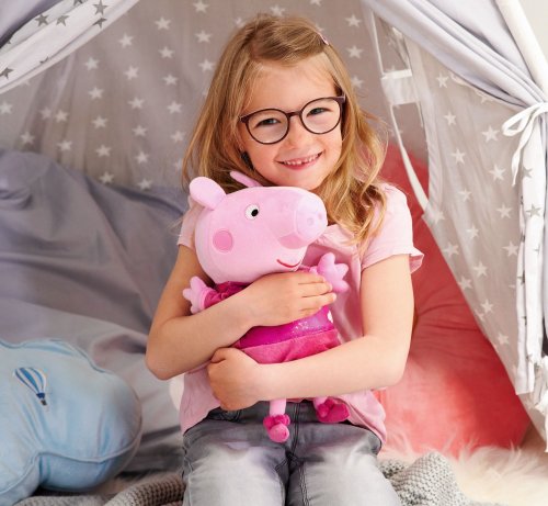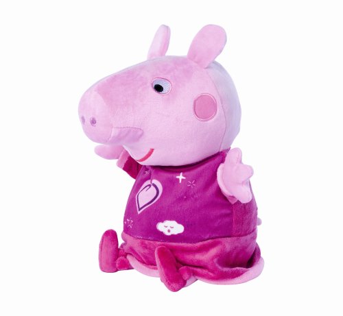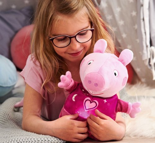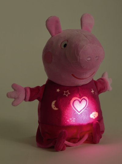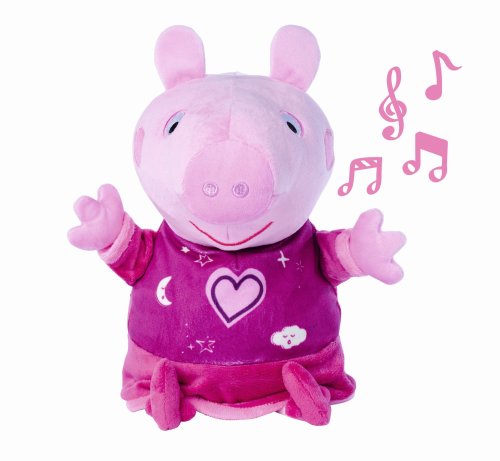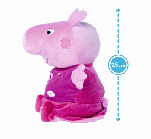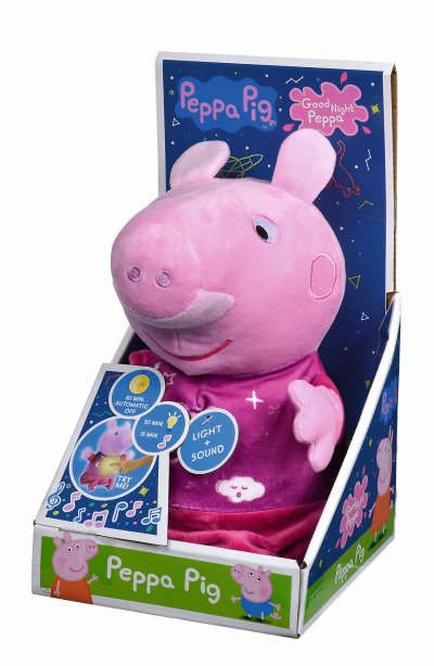 Oblíbené prasátko Peppa v růžovém pyžamku hraje ukolébavku a svítí příjemným nočním světýlkem. Automatické vypínání. Skladba má délku 15 minut, světlo svítí 30 minut. Poté se vše opět automaticky vypne. Výška 25 cm.