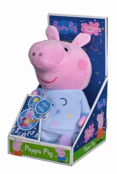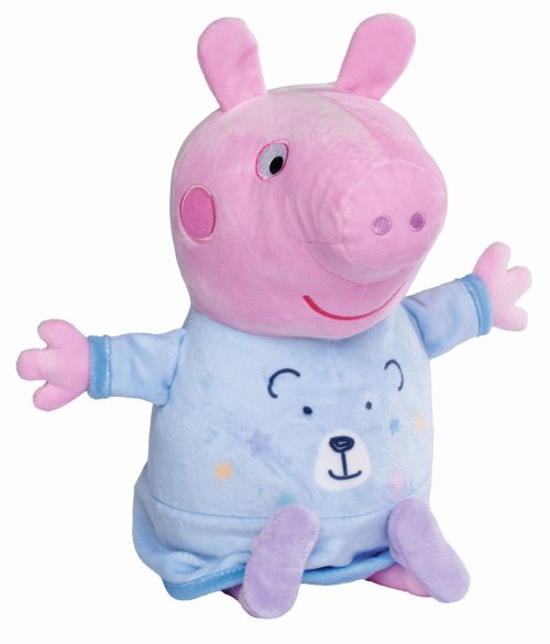 Oblíbené prasátko Peppa v roztomilém modrém pyžamku hraje ukolébavku a svítí příjemným nočním světýlkem. Automatické vypínání. Skladba má délku 15 minut, světlo svítí 30 minut. Poté se vše opět automaticky vypne. Výška 25 cm.