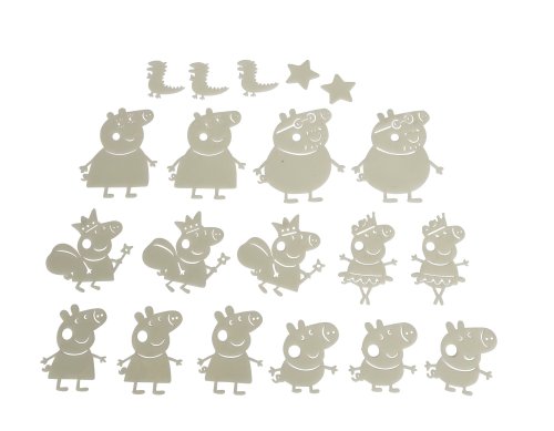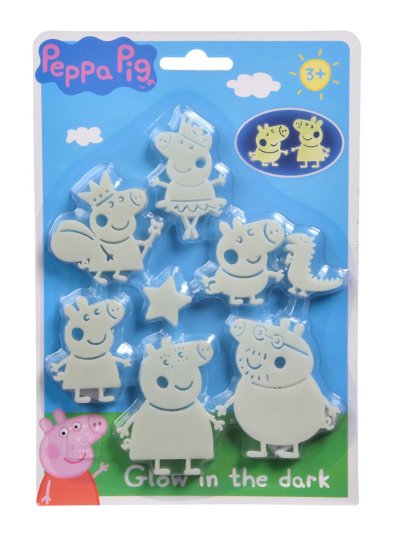 Sada figurek ze seriálu Peppa Pig a dalších obrázků, které po nasvícení ve tmě zpříjemňují usínání menším i větším dětem. Možno nalepit na stěnu, strop, nábytek apod. Obsahuje 20 ks.