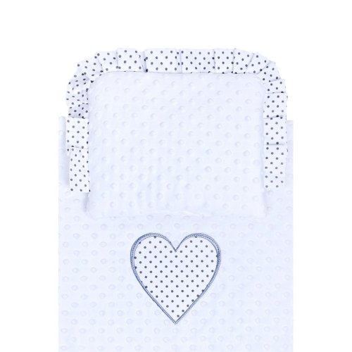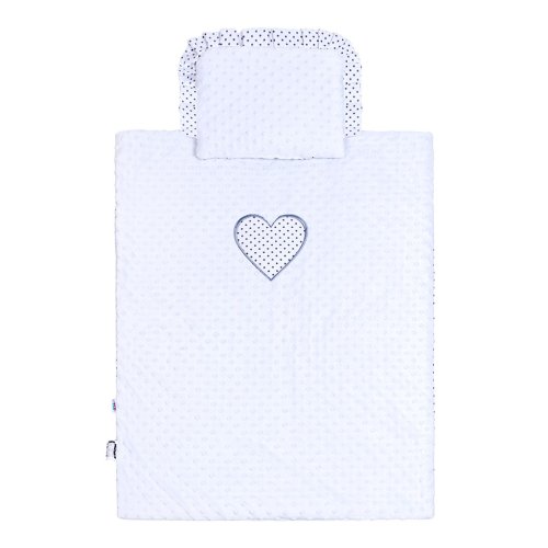 Oboustranný set z Minky New Baby do kočárku. Z jedné strany je minky materiál a z druhé strany bavlněná látka celopotištěná puntíky. Set obsahuje polštářek, který je ozdoben volánkem, a přikrývku, která má na straně minky našité krásné velké puntíkové srdíčko. Klademe důraz na kvalitu a proto jsou peřinky do kočárku ušity z velmi kvalitního materiálu, který nepouští barvu, a nevyvolává alergické reakce. Vše je vyplněno antialergickým vláknem. Složení: povlak 100% bavlna, 100% polyester, výplň 100% polyester. Rozměry: polštářek: cca 25x32 cm, peřinka: cca 82x68 cm. Tyto výrobky jsou bezpečné, protože:<BR>-přírodní bavlna nezpůsobuje odřeniny a podráždění, jelikož neobsahuje formaldehydy a další prvky, které kojencům škodí<BR>- neztrácí barvu a nezabarvuje oblečení<BR>- nabízené vzory jsou příjemné na pohled a mají uklidňující barvy<BR>- nejsou použity žádné knoflíky ani žádné další plastové nebo ocelové části, které mohou být pro Vaše dítě nebezpečné<BR>- materiál, který je používán pro výplně polštářů a přikrývek, je 100% protialergický, což znamená, že se v jeho vláknech nešíří žádné mikroorganismy ani plíseň
