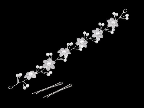 Romantická ozdoba s květy a perlovými korálky bude jemným a elegantním doplňkem účesu. Je tvořená ze dvou do sebe zapletených drátků, do kterých jsou vkomponované voskové korálky připomínající perly a plastové květy. Díky drátkům je ozdoba lehce ohybatelná a lze ji prostorově tvarovat. Čelenku využijete jako nevšední doplněk na svatby, svaté přijímání či na plesy. K vlasům ji upevníte pomocí vlasových sponek, které jsou součástí balení. Můžete ji přivázat i stuhou nebo pruženkou, kterou provléknete do oček (cca Ø7 mm) na koncích ozdoby. Stuha ani pruženka není součástí balení.