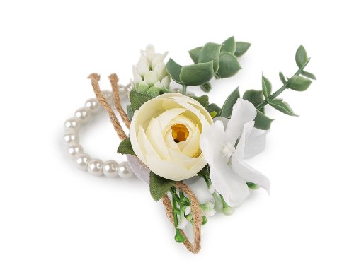 Perlový náramek s růžičkami je určený především pro svědkyni, družičky, maminku nebo jen tak. Potěší všechny ženy, které se rády zdobí romantickými doplňky. Je pružný, má univerzální velikost. Ve středu jsou 3 růžičky doplněné malou hortenzií, bobulemi, větvičkami a listem. Průměr růžiček je 3,5 cm, průměr celého květinového středu je 7,5 cm. Perly mají průměr 0,8 cm.