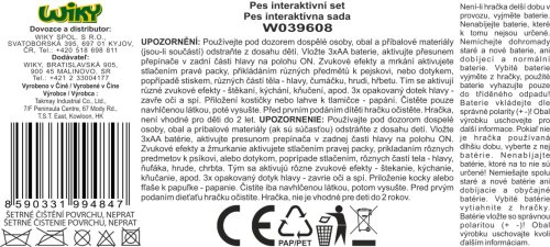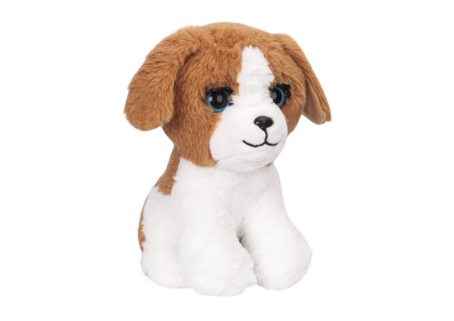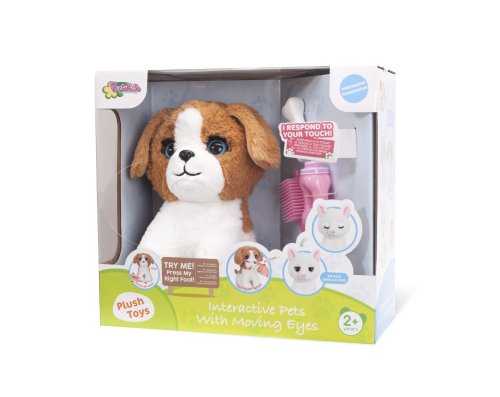 Pes interaktivní set. Velikost 24 cm. Zvukové efekty a mrkání stlačením pravé packy a přiložením předmětů nebo dotykem (stiskem) jiné části těla - hlavy, čumáku, hrudi, hřbetu (štěkání, kýchání a další). 3x rychlý dotek hlavy - zavře oči a spí. Přiložení láhve a kostičky k tlamičce - papání. 3xAA baterie součástí. Přepínač on/off/try me v zadní části hlavy. Součástí hřeben na česání.