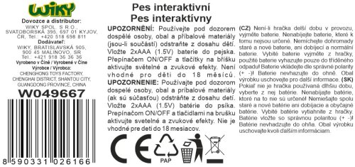 Pes interaktivní pro nejmenší s efekty. Rozměry 22,5x11,5x18,2 cm. ON/OFF přepínač na straně psa. Plyšový s plastovým bříškem. Aktivace tlačítky na bříšku - světelné efekty, zvukové efekty a melodie. Baterie 2xAAA, nejsou součástí.