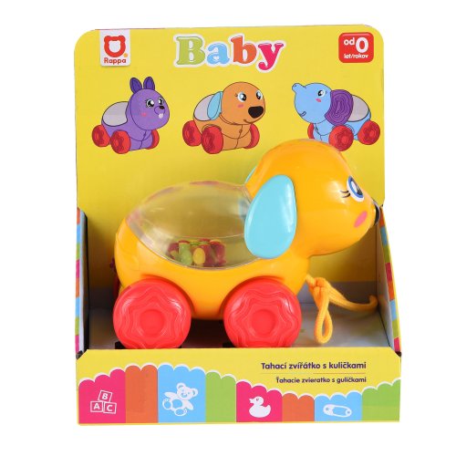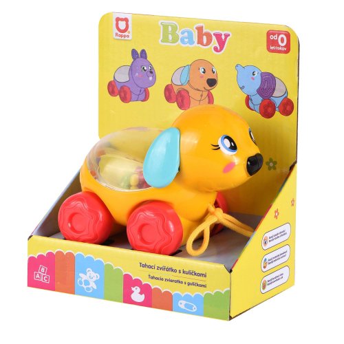 Veselé zvířátko pejsek na kolečkách s barevnými kuličkami. Taháním či pohybem zvířátka začnou kuličky uvnitř poskakovat. Tato hračka zaujme a pobaví i ty nejmenší děti.