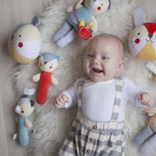 Textilní chrastítko pro děti od narození. Hlavní vlastnosti: Použity barvy na rostlinné bázi šetrné k životnímu prostředíVyrobeno z organické bavlny nejvyšší kvality, certifikováno GOTS