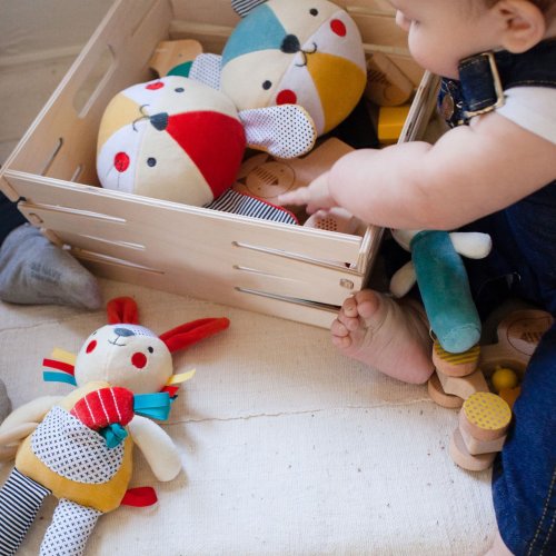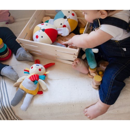 Zábava s chrastícím zajíčkem. Ručně vyrobeny, měkký chrastící zajíček je ideální pro uchopení do drobných rukou. Chrastítko je vyrobeno z organické bavlny nejvyšší kvality s certifikací GOTS. Vhodný od narození. Hlavní vlastnosti: Rozvíjí motorikuVyrobeno z organické bavlny (certifikováno GOTS)Vyplněno certifikovaným recyklovaným polyesteremVhodné od narození