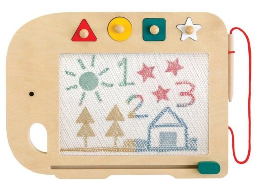 Designová dřevěná magnetická kreslící tabulka. Dítě může psát nebo kreslit s tužkou pevně připojenou na provázku a pomocí čtyř tvarovaných magnetických razítek vytvářet vzory a tvary. Má velkou kreslící plochu se čtyřmi živými barvami. Lišta pro mazání snímků umožňuje dětem vyčistit desku během několika sekund. Tabulka obsahuje 4 dřevěná razítka (trojúhelník, kruh, čtverec, hvězda), která jsou magnetizována, aby zůstala na svém místě. Robustní dřevěná konstrukce se zaoblenými hranami a měkkými rohy je bezpečná a lehce uchopitelná. Dřevěná magnetická kreslící tabulka splňuje všechny bezpečnostní normy. Tolerance několika nemazatelných bodů. Hlavní vlastnosti: Obsahuje 4 dřevěná magnetizovaná razítkaKreslící plocha se 4 barvamiTužka připojená provázkemLišta pro mazání snímků