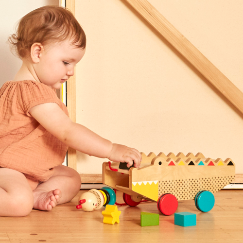 Aligátor je tahací hračkou a vkládačkou v jednom. Pět zavalitých kostek různých tvarů lze jednoduše vložit do otvorů v aligátorovi. Hračka stojí na čtyřech barevných a pogumovaných kolech, které zajišťují hladký pohyb po domácích podlahách. Hračka je vyrobena z odolného dřeva, a tak Vám jistě vydrží po mnoho let. Hlavní vlastnosti: rozvíjí koordinaci ruka-okopodporuje poznávání barev a tvarůšňůrka na tahání a kvalitní kolečka nabádají batolata k chůzivyrobeno z kvalitního dřeva z odpovědných zdrojů a netoxických barev na bázi vodysplňuje všechny bezpečnostní normy Značka a certifikát FSC® (Forest Stewardship Council) zaručuje, že dřevo, ze kterého byl produkt vyroben, nebylo vytěženo nelegálně a pochází z lesů obhospodařovaných šetrným či přírodě blízkým způsobem, ve kterém jsou dodržovány přísné environmentální a sociální požadavky. Značka FSC® na výrobku znamená, že svým nákupem pomáháte chránit lesy a podporujete šetrné, odpovědné či přírodě blízké hospodaření, díky kterému jsou naše lesy stabilnější, zdravější, mají přirozenou druhovou skladbu a lépe odolávají negativním následkům klimatických změn.