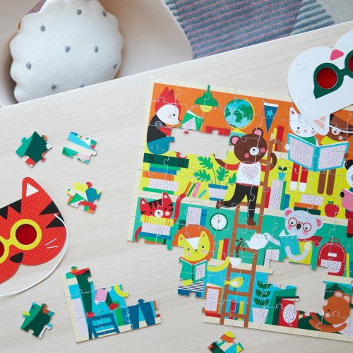 Složte puzzle a pomocí dvou zvířecích 3D brýlí najděte objekty, které se skrývají v rušné scéně. Tato roztomilá zvířátka jsou odhodlána přečíst celou knihovnu, ale ztratila pár věcí v náhodném pořadí. Poskládejte puzzle a pomozte jim najít tyto skryté věci pomocí 3D brýlí. Hlavní vlastnosti: 3D brýlepuzzle je vyrobeno z recyklovaného papíru a potištěné netoxickými barvami, má certifikaci FSC Značka a certifikát FSC® (Forest Stewardship Council) zaručuje, že dřevo, ze kterého byl produkt vyroben, nebylo vytěženo nelegálně a pochází z lesů obhospodařovaných šetrným či přírodě blízkým způsobem, ve kterém jsou dodržovány přísné environmentální a sociální požadavky. Značka FSC® na výrobku znamená, že svým nákupem pomáháte chránit lesy a podporujete šetrné, odpovědné či přírodě blízké hospodaření, díky kterému jsou naše lesy stabilnější, zdravější, mají přirozenou druhovou skladbu a lépe odolávají negativním následkům klimatických změn.