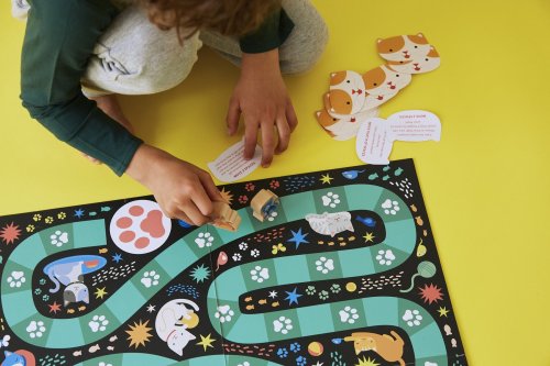 Tato krásná stolní hra otestuje vaše vědomosti o kočkách a jejich dobrodružstvích! Budete plnit některé z 51 úkolů, jako kočky! Vyberte si svou kočičí figurku a můžete začít hrát. Vyhrává ten, kdo jako první vkročí na klubíčko. Obsahuje 1 hrací desku, 4 figurky, 1 dřevěnou kostku, 51 kartiček s úkoly v angličtině, španělštině a francouzštině. Hlavní vlastnosti: obsahuje herní desku, kostku, 4 figurky, 51 kartiček s úkoly ve 3 jazycíchnatištěno rostlinnými barvami dřevěné figurky Zkrácený návod hry:Začíná hráč, který jako poslední v nedávné době pohladil kočku. První hráč hodí kostkou a posune se o počet polí, dle hodnoty hozené na kostce. Pokud stoupne na políčko s kočičí packou, vezme si kartu a splní daný úkol. Splňte úkol a posuňte se o počet polí, který je uveden na kartě. Pokud hráč nemůže splnit úkol z karty, položí ji na odkládací balíček, textem nahoru. Na řadě je další hráč. Hra pokračuje, hráči se na tazích střídají dle určeného pořadí. Házejte kostkou, posouvejte figurky, berte si kartičky dle pacek a plňte úkoly. Pokud jste použili všechny kartičky, jednoduše zamíchejte odkládací balíček a hra může pokračovat.