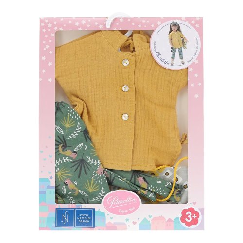 Obleček určený zejména pro panenky Petitcollin řady Finouche. Skládá se z okrové halenky, vzorovaných zelených kalhot, šedé vzorované tašky a čelenky. Oblečky Petitcollin jsou pečlivě zpracované, vynikají francouzskou elegancí, jedinečnou barevností a vzory, díky kterým jsou poutavé a nezaměnitelné. Dodáváno v papírové krabičce s průhledem a plastovým ramínkem. Hlavní vlastnosti:pro panenky o výšce 48 cmhalenka, kalhoty, taška a čelenkavyrobeno ve Francii