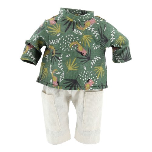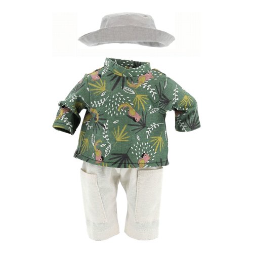 Obleček určený zejména pro panenky Petitcollin řady Minouche. Skládá se ze zelené košile s potiskem, krátkých bílých kalhot, šedého kloboučku a šedého batůžku. Oblečky Petitcollin jsou pečlivě zpracované, vynikají francouzskou elegancí, jedinečnou barevností a vzory, díky kterým jsou poutavé a nezaměnitelné. Dodáváno v papírové krabičce s průhledem a plastovým ramínkem. Hlavní vlastnosti:pro panenky o výšce 34 cmkošile, krátké kalhoty, klobouček a batůžekvyrobeno v Tunisku