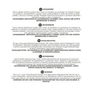 UPOZORNĚNÍ Toto je dětský zádržný systém typu i-Size. Je schválen pro používání na místech k sezení ve vozidlech kompatibilních s typem i-Size, 129, jak výrobci vozidel uvádějí v příručce uživatele vozidla. Případně nejasnosti konzultujte s výrobcem dětského zádržného systému nebo s prodejcem. UPOZORNĚNÍ! NEPOUŽÍVEJTE AUTOSEDAČKU VE SMĚRU JÍZDY, DOKUD VĚD DÍTĚTE NEPŘESÁHNE 15 MĚSÍCŮ!