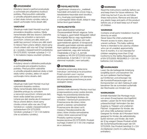 Obsahuje malé části! Montáž musí být provedena dospělou osobou. Nikdy nenechávejte dítě bez dozoru! Zabraňte přístupu ke schodům a nerovným povrchům. Určeno pro děti, které umí sedět bez pomoci! Určeno pro děti starší 6 měsíců! Není určeno dětem, které samy chodí a které váží více než 12 kg! Výrobek je v souladu s bezpečnostními normami EN 1273:2005