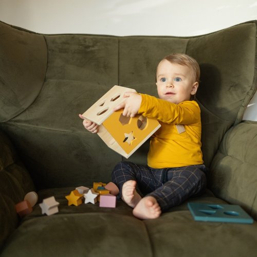 Souprava obsahuje dřevěnou kostku se čtyřmi stranami pro třídění a 12 barevných kostek různých tvarů, například trojúhelníku, hvězdy, čtverce, kosočtverce nebo kruhu. Když jsou všechny dílky uvnitř třídící kostky, jednoduše vysunete horní kryt, abyste je mohli snadno vyjmout zpět. Děti mohou nejen přiřazovat tvary k otvorům a třídit díly, ale také je používat ke stavbě různých prvků. Hračka je určena pro děti od 1 roku. Souprava obsahuje třídící kostku a 12 barevných dílků. Každý prvek je pečlivě testován, odolný vůči házení a úderům, což zaručuje trvanlivost i během intenzivní hry.