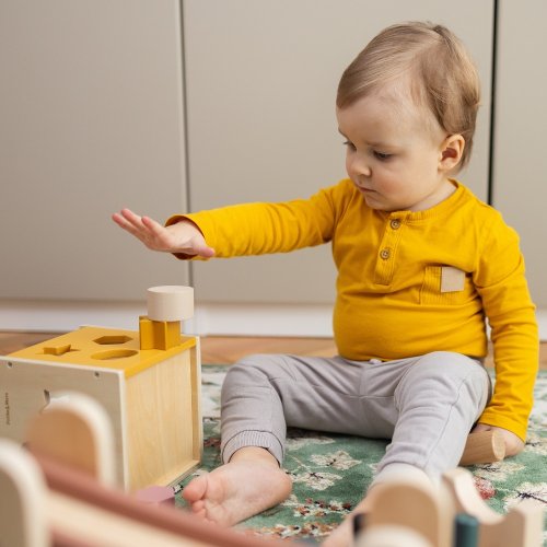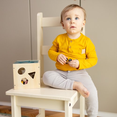 Souprava obsahuje dřevěnou kostku se čtyřmi stranami pro třídění a 12 barevných kostek různých tvarů, například trojúhelníku, hvězdy, čtverce, kosočtverce nebo kruhu. Když jsou všechny dílky uvnitř třídící kostky, jednoduše vysunete horní kryt, abyste je mohli snadno vyjmout zpět. Děti mohou nejen přiřazovat tvary k otvorům a třídit díly, ale také je používat ke stavbě různých prvků. Hračka je určena pro děti od 1 roku. Souprava obsahuje třídící kostku a 12 barevných dílků. Každý prvek je pečlivě testován, odolný vůči házení a úderům, což zaručuje trvanlivost i během intenzivní hry.