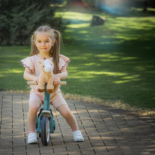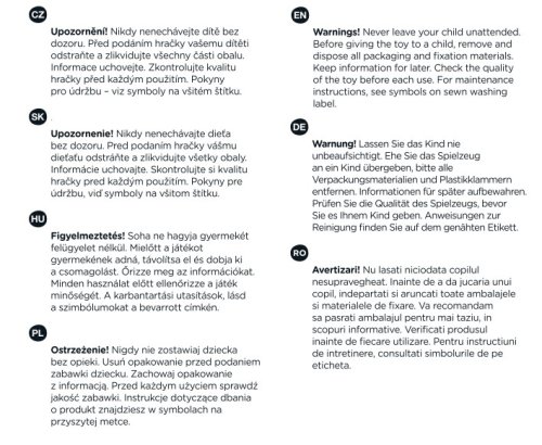 Koník je vyroben z velmi příjemného materiálu, s krátkými štětinami. Pokud se zašpiní, můžete jej ručně vyprat při teplotě 30 °C. Díky různým tvarům a texturám podněcuje dětskou představivost a fantazii a rozvíjí poznávací schopnosti.
