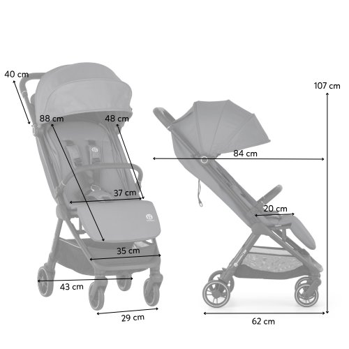 Rozměry rozloženého kočárku: 84 cm (délka od předního kolečka k rukojeti) × 43 cm (šířka) × 107 cm (výška)