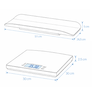 Rozlišení: 5 g (váha zobrazuje hmotnost po 5 g) Přesnost měření: • 0 kg ≤ m ≤ 5 kg: ±50 g • 5 kg < m ≤ 20 kg: ±100 g • 20 kg < m ≤ 50 kg: ±150 g • 50 kg < m ≤ 100 kg: ±200 g • 100 kg < m ≤ 180 kg: ±300 g Váha (bez vaničky) • Rozměry: 30 × 30 × 2,5 cm • Hmotnost: 1,5 kg • Materiál: 6 mm tvrzené sklo Vanička pro vážení kojenců • Rozměry: 51 × 26,5 × 5 cm • Hmotnost: 0,39 kg Maximální zatížení: 180 kg Maximální zatížení v režimu kojenec: 20 kg Provozní podmínky: 0–40 °C, relativní vlhkost 25–85 % (bez kondenzace) Podmínky skladování: –20 až 60 °C, relativní vlhkost 20–90 % (bez kondenzace) Celková hmotnost výrobku: cca 3,9 kg Celkové rozměry (sestavené): cca 56 × 33 × 5 cm