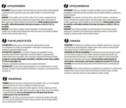 UPOZORNĚNÍ! Tento produkt je určen pro děti ve věku od 0 do 5 měsíců, s hmotností do 9 kg. Přestaňte tento výrobek používat, pokud je dítě schopno sedět, plazit se nebo postavit se. Nikdy nepoužívejte vaničku postýlky bez nosné konstrukce. Dětská postýlka je určena pouze pro použití s rodičovskými postelemi, které mají vrch matrace ve výšce 56,5-68,5 cm od podlahy.