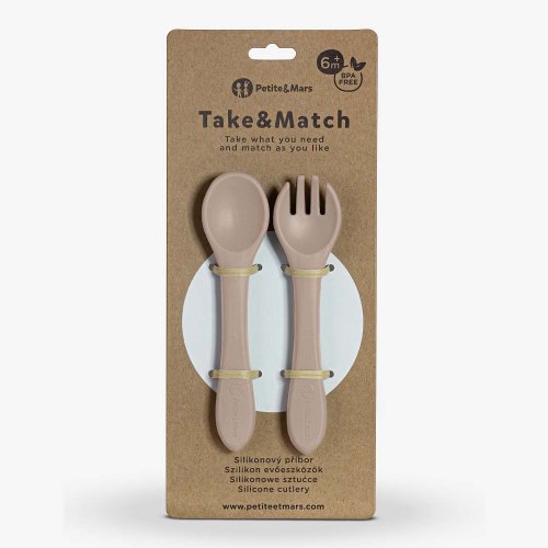 TAKE&MATCH série TAKE what you need and MATCH as you like. Vyberte si výrobky, které vaše dítě potřebuje, a slaďte je barevně podle svých představ. Jídelní sety jsou k dispozici v barvách inspirovaných nejnovějšími trendy a zkomponovány tak, aby každá barva dokonale ladila s ostatními. Můžete proto libovolně kombinovat všechny prvky potřebné k přípravě bezpečného jídla pro vaše dítě a vytvořit si tak vlastní jedinečnou kolekci. Díky naší sérii se krmení vašeho dítěte stane nejen velmi jednoduchým, ale také estetickým a příjemným. Silikonový příbor TAKE&MATCH Souprava sestávající z vidličky a lžičky je celá vyrobena z potravinářského silikonu bez obsahu BPA. Díky tomu může vaše dítě jíst příborem teplá i studená jídla. Díky pružnému silikonu je příbor ideální pro citlivé dásně malého dítěte. Příbor je vhodný pro děti od 6 měsíců, které se seznamují s pestrou stravou, a pro ty, které se již úspěšně učí jíst samy. Zaoblené tvary a malé rozměry usnadňují děťátku jejich uchopení a tím i papání. Příbor lze sladit s jiným výrobkem z řady TAKE&MATCH ve stejné nebo hodící se barvě.