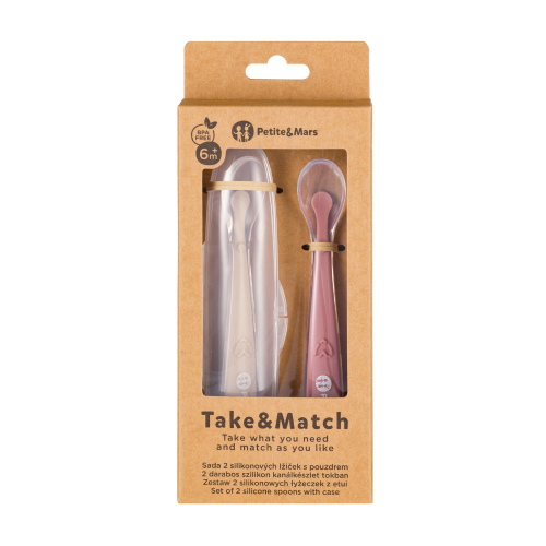 PETITE&MARS Silikonové lžičky s pouzdrem, sada 2 ks, Take&Match Sand - Rose 6m+