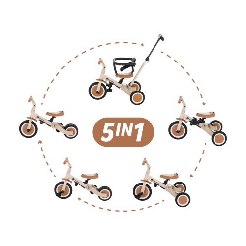 Multifunkční tříkolka určená pro děti od 1,5 do 5 let nebo do 25 kilogramů. Je to nejen dopravní prostředek pro přesun a učení se rovnováhy, ale také společník pro rostoucí dítě během mnoha vývojových fází. Promyšlené měnění se kola se přizpůsobuje potřebám děťátka podle toho, jak se vyvíjejí jeho motorické schopnosti. Zpočátku je to tříkolka s možností asistence rodiče, zatímco konečná verze je standardní kolo s pedály, bez jakýchkoli dalších podpůrných prvků. Díky takovým změnám můžete pomoci svému dítěti naučit se jezdit na dvou kolech.