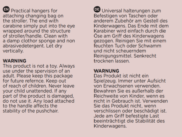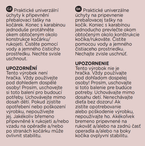 Praktické úchyty k připevnění přebalovací tašky na kočár. Konec s karabinou jednoduše protáhněte okem obtočeným okolo konstrukce kočáru/ rukojeti.