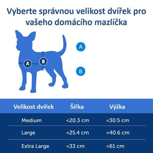 | Velikost dvířek | Hmotnost psa | Maximální šířka ramen psa | Celková velikost dvířek | Velikost otvoru | Velikost montážního otvoru |