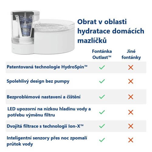 Seznamte se s PetSafe® Outlast™ 1,7 litrovou bezpumpovou fontánkou pro domácí mazlíčky – první fontánou pro kočky a psy na světě bez tradiční pumpy! PetSafe® patentovaná technologie HydroSpin™ udržuje vodu proudící a odstraňuje problémy, které přicházejí s tradičními fontánami. Filtrační systém udržuje chuť a svěží vzhled vody, díky čemuž má Váš mazlíček zdravější zážitek z hydratace.