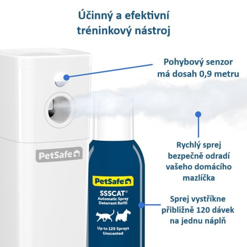 Zvědavé kočky a psi často zkoumají oblasti, kde není jejich přítomnost žádoucí, jako jsou např. kuchyňské pracovní desky nebo odpadkové koše. Automatický sprejový odpuzovač pomáhá udržovat domácí zvířata v bezpečí tím, že jim brání v přístupu do těchto prostor. Zařízení detekuje pohyb Vašeho domácího mazlíčka až do vzdálenosti 0,9 m a poté vystříkne jednu dávku neškodného spreje bez zápachu, a tím ho odradí od vstupu do zakázané oblasti. PetSafe® SSSCAT® tak poslouží jako další nástroj, který Vám pomůže udržet Vašeho domácího mazlíčka mimo potenciální nebezpečí v domácnosti.