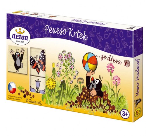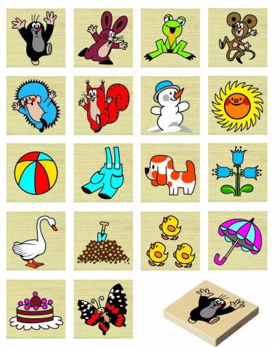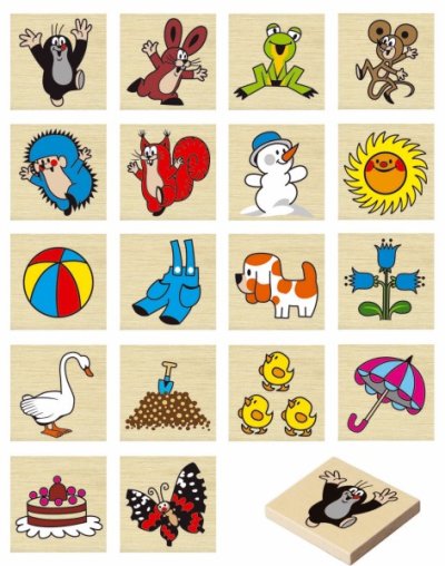 Pexeso z dřevěných kamenů o rozměrech 40x40x6mm s veselými obrázky Krtka a jeho přátel. Procvičování a soustředění paměti dětí.