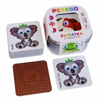 Originální pexeso v malé plechové krabičce s krásně ilustrovanými obrázky roztomilých zvířátek. Česko - slovensko - anglické pexeso, 32 obrázků s českým a slovenským názvem a 32 obrázků s anglickým názvem a výslovností. Kartičky jsou vyrobeny z kvalitního karetního kartonu se speciálním karetním lakem, který zaručí opravdu dlouhou životnost kartiček. Rozměry balení 6 x 6 x 4 cm. Vhodné pro děti od 3 let.