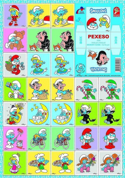pevný karton s lesklou vodoodpudivou povrchovou úpravou, velikost kartiček 4 x 4 cm (š x d), na pexesech u titulního obrázku umístěn box k vystřižení pro možnost vložení vystřižených kartiček.