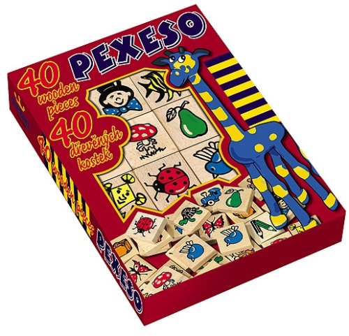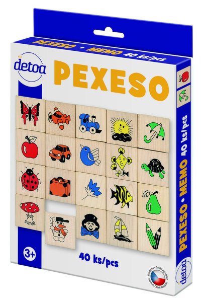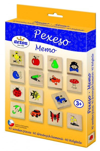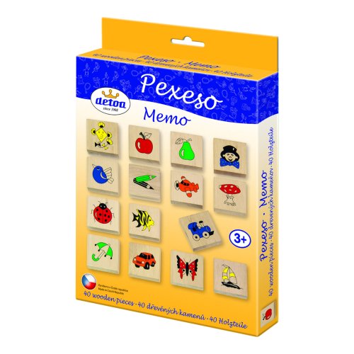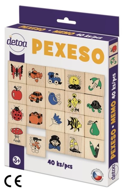 Dřevěné pexeso s barevnými obrázky pro procvičení soustředění a paměti. Hra obsahuje 40 kusů o velikosti 40 x 40 x 10 mm. Baleno v krabici z tvrdého papíru. Nevhodné pro děti do 3 let. Obsahuje malé části. Výrobek je zdravotně nezávadný.