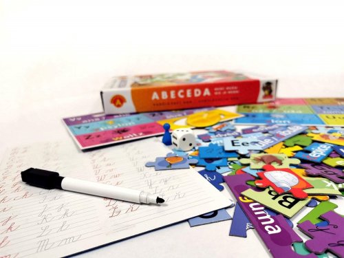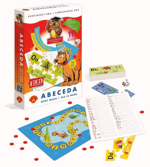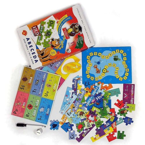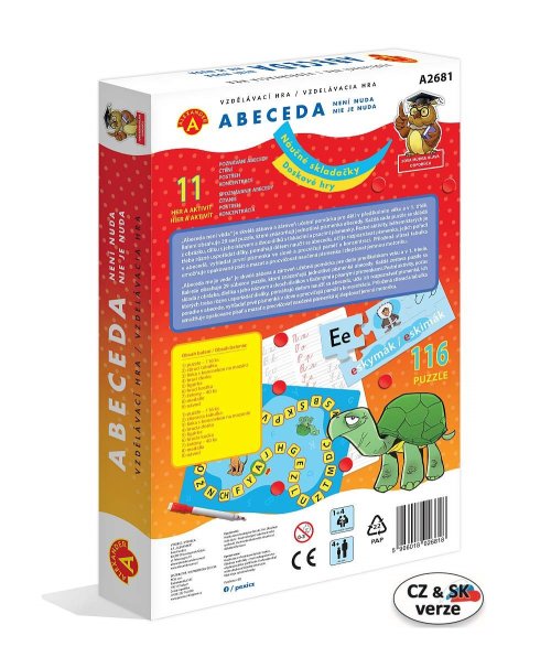 „Abeceda není nuda“ je skvělá zábava a zároveň učební pomůcka pro děti v předškolním věku a prvňáčky. Celkem 11 zábavných her a aktivit pro děti od 4 do 8 let. Zábavný způsob, jak si poradit s abecedou, jejím čtením a psaním. Hra obsahuje fixku a mazací tabulku, kde děti opakovaně trénují správný úchop pera a zdokonalují psaní písmenek. Trénuje také postřeh a koncentraci. Balení obsahuje 163 dílů. Balení obsahuje 29 sad puzzlí, která znázorňují jednotlivá písmenka abecedy. Každé puzzle se skládá ze čtyř dílků – s obrázkem, s jeho názvem a s odpovídajícími tiskacími a psacími písmenky. Bohaté varianty hry, během nichž je třeba různě uspořádat či vyhledat jednotlivé dílky. Pomáhají dětem naučit se abecedu, dále je učí rozpoznávat písmenka a jejich pořadí v abecedě či vyhledávat počáteční písmenka ve slovech a zároveň procvičují paměť a koncentraci. Přiložená stírací tabulka umožňuje opakovaně psát a procvičovat naučená písmenka a zlepšovat jemnou motoriku. Děti si mohou hrát samy nebo ve větších skupinách. Je vhodné, aby se hry spolu s dětmi zúčastnila dospělá osoba, která bude ukazovat různé verze hry a pomáhat dětem s obtížnějšími úkoly. Pokud se děti teprve začínají učit abecedu, měl by dospělý před zahájením hry urovnat puzzle v abecedním pořadí a číst nahlas název každého písmenka a slovo, které je na obrázku. Další pomůcky žetony, figurka, barevná hrací deska a kostka zvyšují rozmanitost a zaručují dobrou zábavu. Za vítězství ve hře je udělována medaile „Mistr abecedy“. Jak hrát?V příručce najdete 11 návodů na různé hry a aktity, při kterých děti načerpávají potřebné znalosti a dovednosti. Díky nim se seznámí s písmeky, jejich psaním a významem. Trénují jejich používání v běžných slovech maximálně zábavnou formou. 1. PUZZLE ABECEDA (hra), 2. ABECEDNÍ SKLÁDAČKA (aktivita), 3. HÁDANKA (hra), 4. KTERÉ PÍSMENKO? (hra), 5. CO JE TO? (aktivita), 6. PÍSMENKEM… (aktivita), 7. ZÁVOD (hra), 8. JMÉNA (aktivita), 9. PÍSMENKOVÉ PEXESO (hra), 10. ZÁVOD (desková hra), 11. MISTR ABECEDY (desková hra). Balení obsahuje: puzzle s písmenky a obrázky 116 ksstírací tabulku na trénink písmenek 1 ksfixku s koncovkou na mazání 1 kshrací desku 1 kshrací figurku 1 kshrací kostku 1 ksžetony 40 ksmedaile Mistr ABECEDY 1 ksčeský a slovenský návod ke hře Hlavní vlastnosti: ideální pro předškoláky a prvňáčkytrénuje také postřeh, pamět a koncentracizábavné seznámení s písmenky abecedyučení správného úchopu pera a jemné motoriky