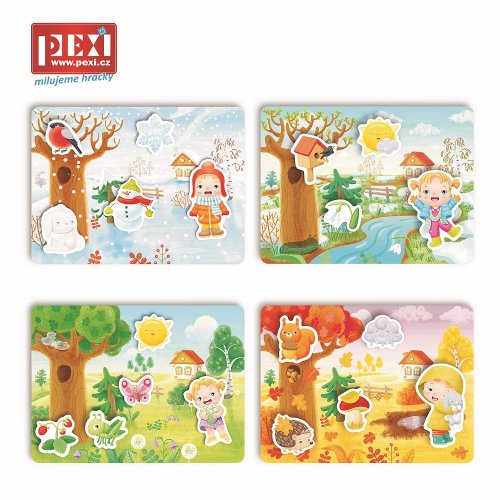 Zjistěte jak to fuguje v přírodě během celého roku a naučte se více o ročních obdobích. Trénujte mluvení, jemnou motorikua koordinaci ruka-oko. Kdy děláte sněhové koule? Kdy můžete jít do lesa sbírat lesní ovoce a houby? Co je uvnitř?Sada obsahuje 4 velké pružné plastové destičky se suchým zipem a 20 samostatných dílků, které umístíte na destičky pomocí suchého zipu. Díky této vychytávce jednotlivé díly jen tak nespadnou a budou držet na správném místě. Všechny části jsou vyrobené z odolného, ale tenkého plastu se speciální povrchovou úpravou, která je dětem příjemná na dotek. Jak hrát? Berte jednotlivé dílky jeden po druhém a povídejte dětem co na nich je.Potom vezměte destičku se stíny předmětů a vybídněte dítě, aby našlo správný předmět pro každý obrys a připevnilo ho pomocí suchého zipu na správné místo. Hlavní vlastnosti: zlepšuje motorické schopnosti trénuje vyjadřování a mluvenou řeč rozvíjí myšlení a paměť upevňuje udržení pozornosti