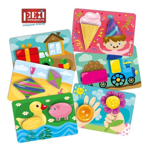 Naučná skládačka pro děti od 12 měsíců. 6 pružných plastových destiček se suchým zipem a 12 velkých samostatných dílků, které umístíte na destičky pomocí suchého zipu. Poznáte jaký je tvar draka, zmrzliny nebo slunce?