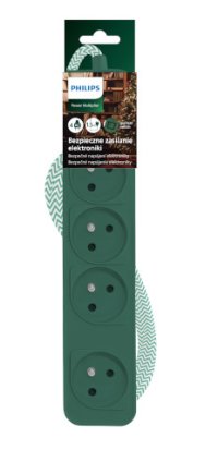 Prodlužovací kabel Philips CHP2147G/60 Klasický prodlužovací kabel 4 AC zásuvky Délka kabelu 1,5 m Hlavní vypínač napájení Bezpečnostní ochrana - dětská závěrka Speciální design - vánoční zelená barva …