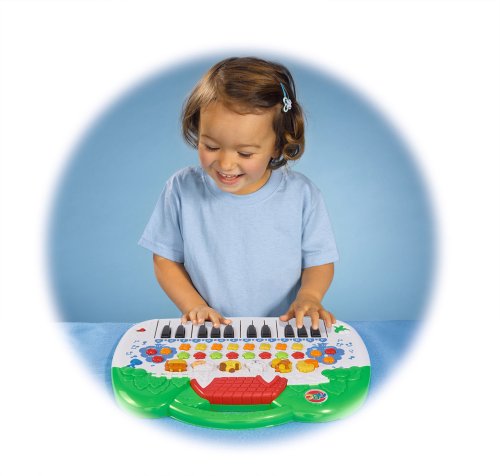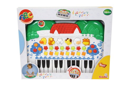 Piáno se zvířátky s různými zvuky a funkcemi: 8 hudebních nástrojů (piano, housle, trubka, klarinet, varhany, xylofon, ukulele, zvonky), 6 zvuků zvířat (kůň, ovečka, ptáček, pes, kachnička, kravička), 8 melodií, možnost nahrávání a přehrávání, tlačítko „potlesk” a vykřiknutí „yeh”, regulace hlasitosti, změna tempa, funkce stop, klasické klavírové klávesy, na kterých můžete zahrát stupnici nebo stupnici podle zvířátek a světelné efekty. Rozměry 28 x 39 cm.